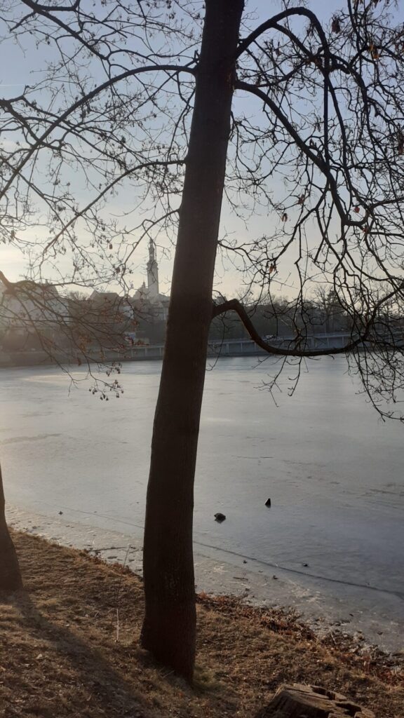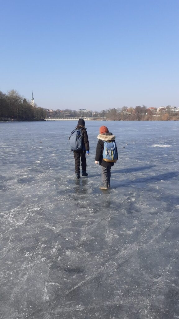 Wir hatten natürlich keine Ausrüstung dabei, abgesehen davon, dass ich Schlittschuhe das letzte Mal vielleicht mit 15 Jahren besessen habe. Aber zu Fuß macht es auch Spaß! Nach meinem anfänglichen Misstrauen, ob das doch nicht etwas gefährlich sei, von einer auf die andere Seite des Stausees zu gehen, haben wir uns auf den Weg begeben. Es war toll und zum Glück auch sicher, weil die Eisschicht dick genug war. Diese tolle Überraschung haben wir voll genossen. Später haben wir dann erfahren, dass der Stausee Jordán im Jahr 1492 als Trinkwasserspeicher für die Stadt gebaut wurde und angeblich der älteste Talwasserspeicher Mitteleuropas ist.