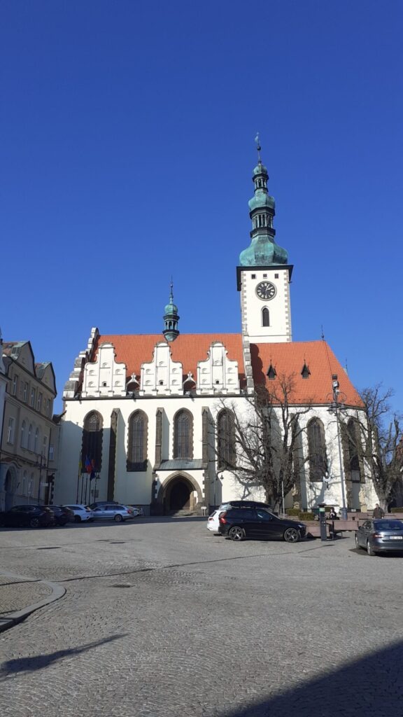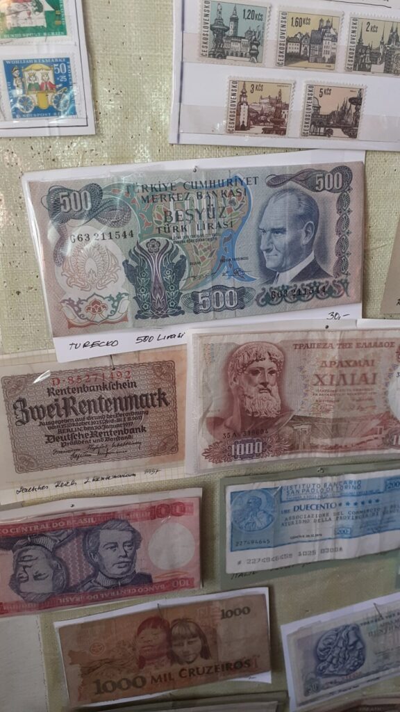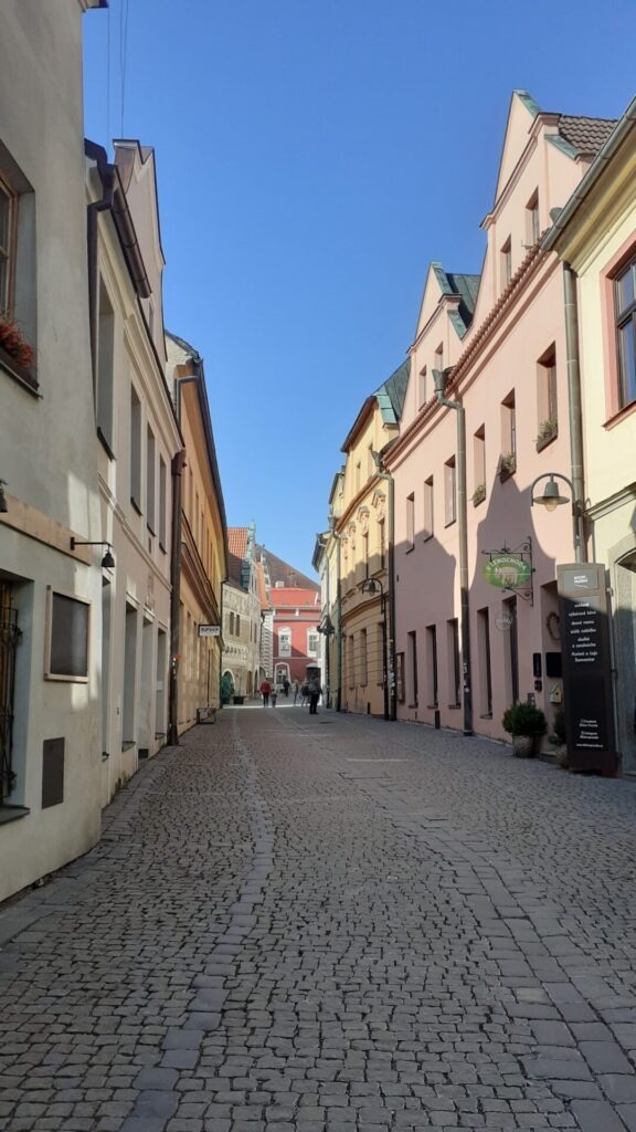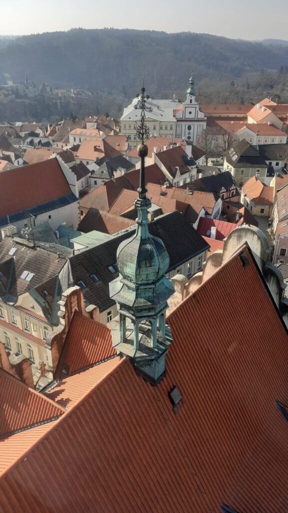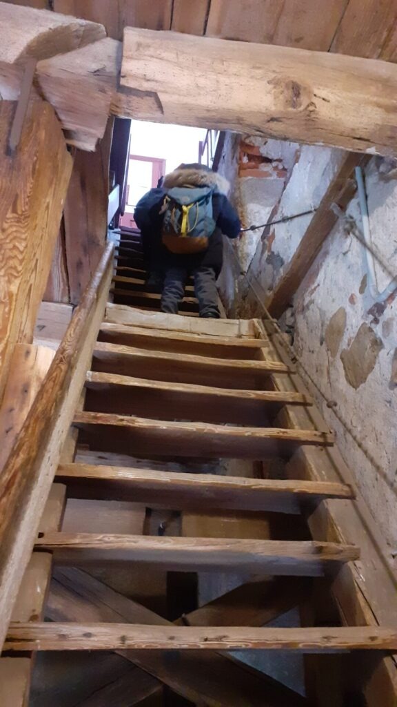 Die Sonne schien den ganzen Tag und nach diesem einmaligen Erlebnis sind wir gut gelaunt im historischen Zentrum angekommen. In der Nähe des Stadtplatzes habe ich erfreulicherweise gleich mehrere Cafés gesichtet, die sehr einladend und versprechend aussahen. Aber zuerst auf den Marktplatz und hoch auf den Kirchturm. Auch das hat sich gelohnt, es gab nur ein paar vereinzelte Touristen und Touristinnen, die den Turm auch bestiegen. Der letzte Abschnitt des Aufstiegs bestand aus sehr steilen Stufen aus Holz und ganz oben wartete auf uns eine wunderbare Aussicht und eine spezielle Ausstellung von Geldscheinen, Münzen und Briefmarken aus verschiedensten Zeiten und Orten der Welt. Und es handelte sich um eine Verkaufsausstellung – auch sehr interessant.